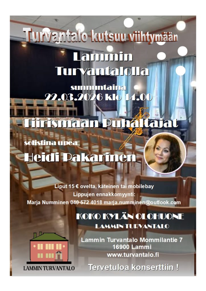 Sunnuntaina 22.03.2026 klo 14:00 Konsertti Lammin Turvantalolla.